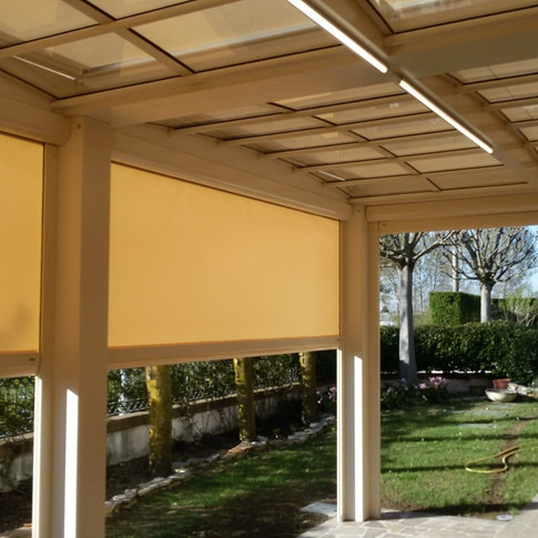 Pergola in alluminio e policarbonato, arricchita con tende “Zip ” laterali, e con una particolare tenda in tessuto filtrante posta sopra la struttura, che mediante un rinvio di cavi tensionati da una molla, ombreggia e protegge dal sole. Tutte le tende sono motorizzate e comandate da un singolo telecomando. tende da sole padova
