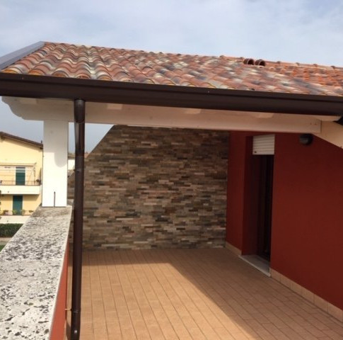Pergolato in legno lamellare sbiancato, con copertura in pannello coppo isolante. Completo di lattoneria, realizzato e personalizzato su misura, nella forma e colore a seconda delle esigenze del cliente.